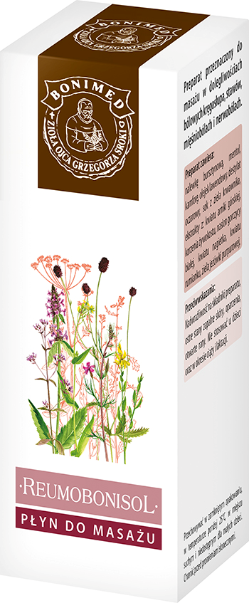 REUMOBONISOL – płyn do masażu. Preparat przeznaczony do masażu w dolegliwościach bólowych kręgosłupa, stawów, mięśniobólach i nerwobólach.
